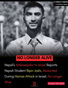 “As part of the first phase of the proposed ‘Middle East Peace Plan’ aimed at ending the conflict that began on October 7, 2023, prisoner exchanges are taking place today [Monday],” said Nepal’s Ministry of Foreign Affairs. “It was expected that Bipin Joshi, a Nepali student participating in Israel’s Learn and Earn programme and held captive by Hamas since the mentioned date, would also be included in the list of hostages to be released by Hamas.”