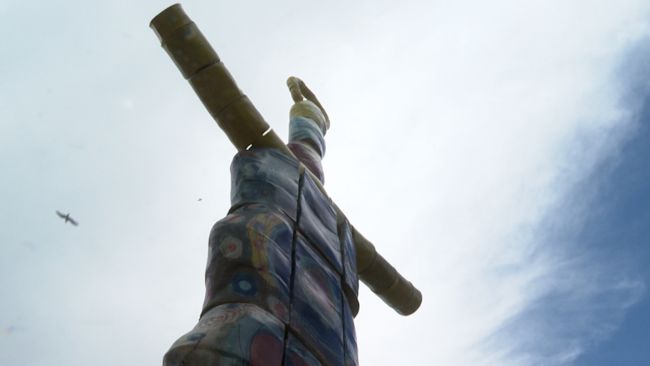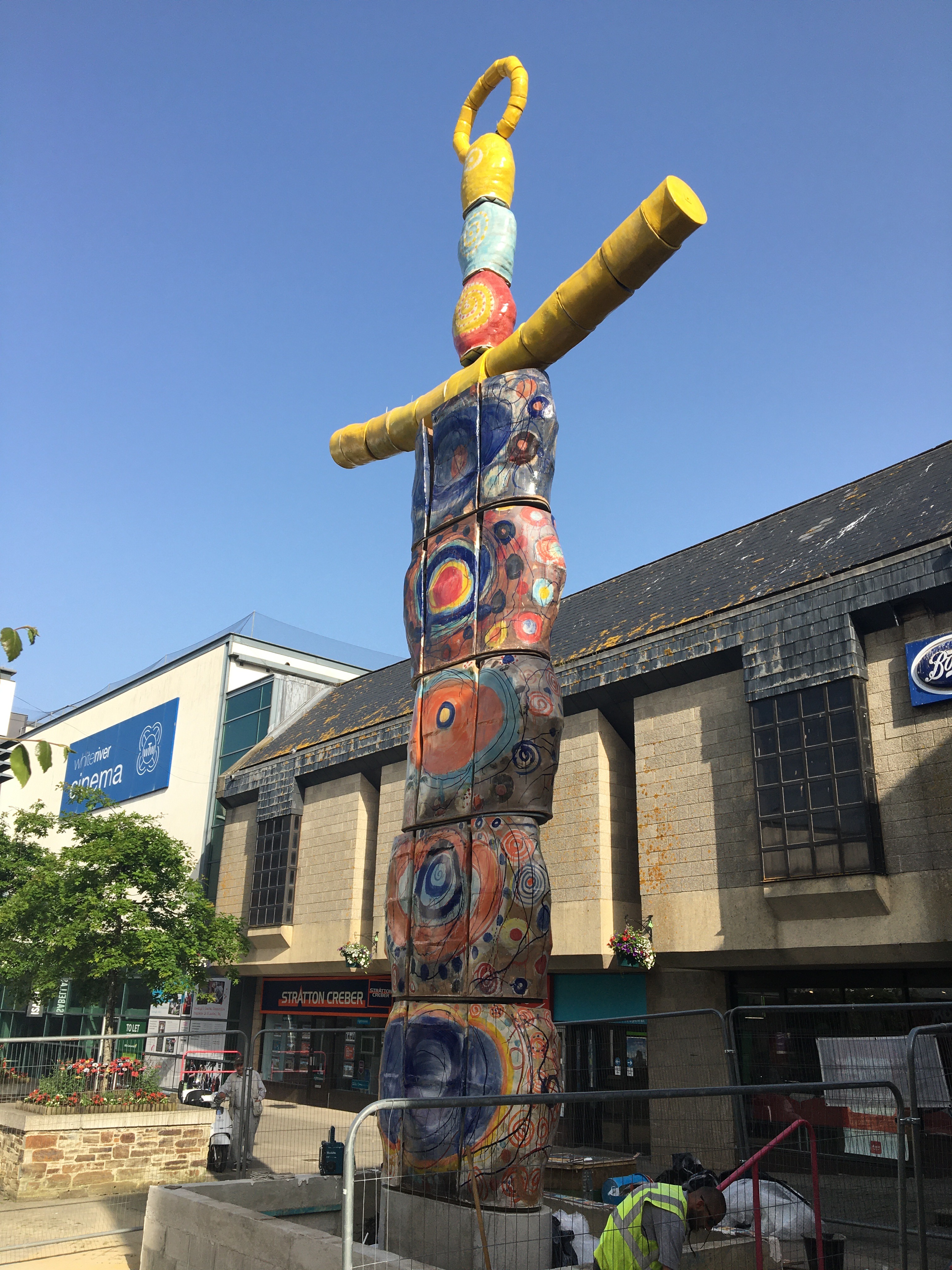 The controversial installation was revealed to the public in June. It is made from five large circles of St Austell’s China clay topped with outstretched arms and decorated in flashes of bright colour.