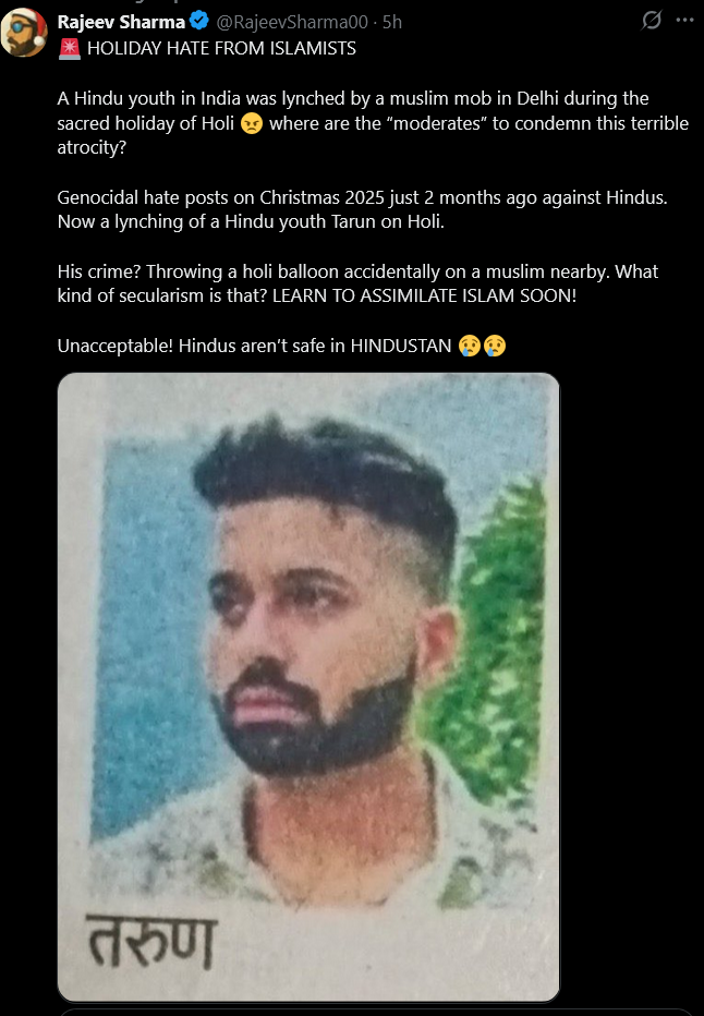 HOLIDAY HATE FROM ISLAMISTS A Hindu youth in India was lynched by a muslim mob in Delhi during the sacred holiday of Holi where are the “moderates” to condemn this terrible atrocity? Genocidal hate posts on Christmas 2025 just 2 months ago against Hindus. Now a lynching of a Hindu youth Tarun on Holi. His crime? Throwing a holi balloon accidentally on a muslim nearby. What kind of secularism is that? LEARN TO ASSIMILATE ISLAM SOON! Unacceptable! Hindus aren’t safe in HINDUSTAN-Rajeev Sharma