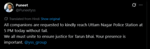 All companions are requested to kindly reach Uttam Nagar Police Station at 5 PM today without fail. We all must unite to ensure justice for Tarun bhai. Your presence is important – Puneet@Puneetyss
