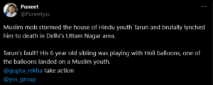 A Muslim mob stormed the house of Hindu youth Tarun and brutally lynched him to death in Delhi’s Uttam Nagar area. Tarun’s fault? His 6-year-old sibling was playing with Holi balloons, one of the balloons landed on a Muslim youth.-Puneet @Puneetyss
