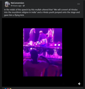 “We will convert all Hindus into the muzzlimm religion in India” and supposedly a Hindu goes all Bruce Lee, jumps on the stage, and gives him a flying kick followed by punches.”
