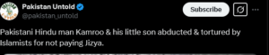 According to this video allegedly, a Pakistani Hindu man known as Kamroo along with his little son have been abducted & tortured by Islamists for not paying Jizya- an Islamic tax that non-muslims are forced to pay. More Updates soon.
