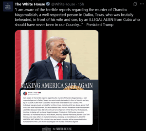 “I am aware of the terrible reports regarding the murder of Chandra Nagamallaiah, a well respected person in Dallas, Texas, who was brutally beheaded, in front of his wife and son, by an ILLEGAL ALIEN from Cuba who should have never been in our Country…” – President Trump