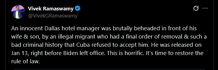 An innocent Dallas hotel manager was brutally beheaded in front of his wife & son, by an illegal migrant who had a final order of removal & such a bad criminal history that Cuba refused to accept him. He was released on Jan 13, right before Biden left office. This is horrific. It’s time to restore the rule of law.- Vivek Ramaswamy