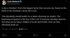 “Is she a Christian? That’s the biggest factor that concerns me. Based on the bindi on her forehead, I worry she is not. That absolutely should matter to us when choosing our leaders. The beginning of wisdom is the fear of the Lord. If someone worships demons, then they are by nature children of wrath and foolish. How can they effectively leads us?”
