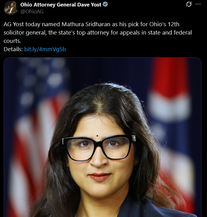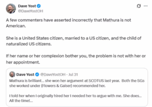 Ohio Attorney General Dave Yost responded to the haters with , “A few commenters have asserted incorrectly that Mathura is not American. She is a United States citizen, married to a US citizen, and the child of naturalized US citizens. If her name or her complexion bother you, the problem is not with her or her appointment.”