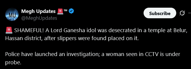 A Lord Ganesha idol was desecrated in a temple at Belur, Hassan district, after slippers were found placed on it. Police have launched an investigation; a woman seen in CCTV is under probe. – Mega Updates