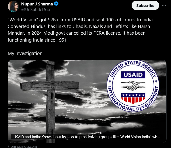 USAID along with pushing American policies to meddle in foreign countries has also been allegedly accused of funding a charity linked to a front group of Pakistani terror group Lashkar-e-Taiba. Other crimes it’s accused of also include funding 2 billion or more to “World Vision” in India opening the door to convert Hindus while funds went indirectly to Jihadis, Naxal terrorists. In 2024, the Modi govt cancelled its FCRA license.