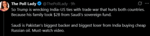 So Trump is wrecking India–US ties with trade war that hurts both countries. Because his family took $2B from Saudi’s sovereign fund. Saudi is Pakistan’s biggest backer and biggest loser from India buying cheap Russian oil.