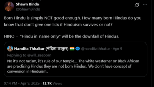 “Born Hindu is simply NOT good enough. How many born Hindus do you know that don’t give one lick if Hinduism survives or not? HINO = “Hindu in name only” will be the downfall of Hindus.”