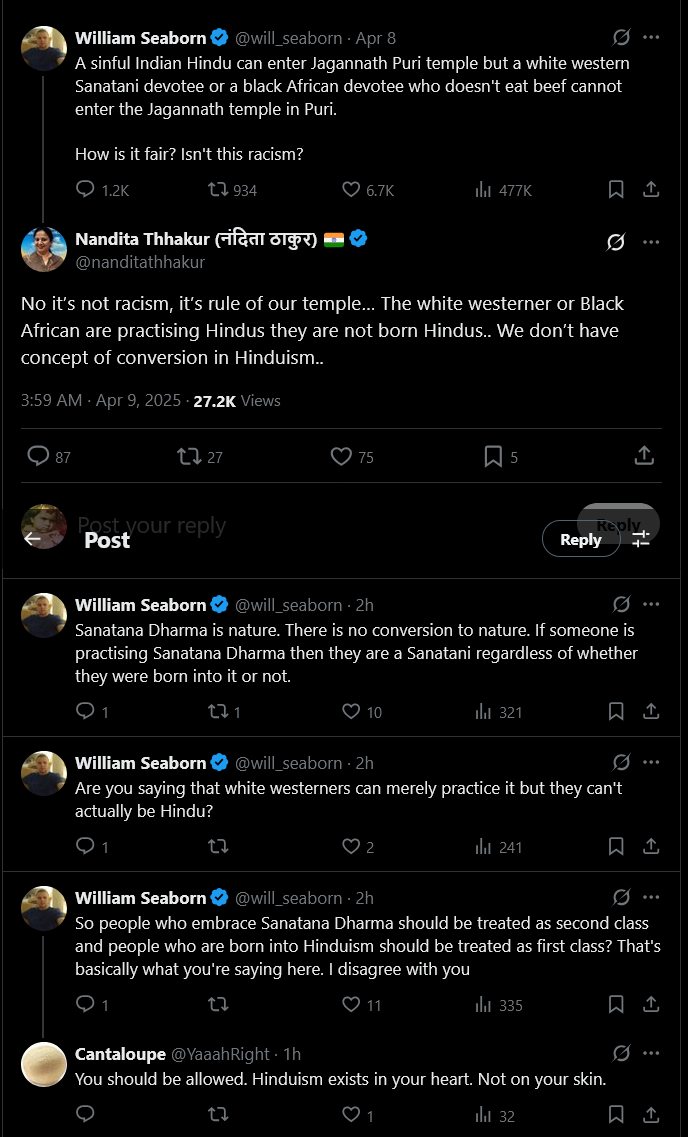 In this latest example where a white British Hindu, William Seaborn @will_seaborn is told by a brown Indian Hindu, Nandita Thhakur @nanditathhakur that you can only be Hindu if you are born a Hindu, so you can’t enter the Jagannath Puri temple.